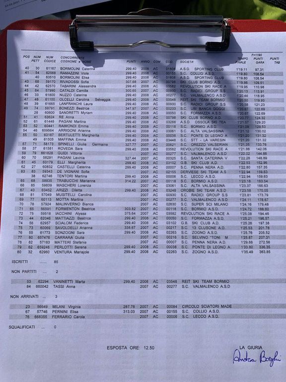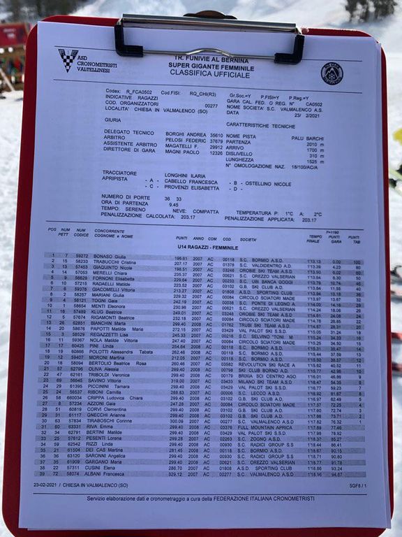 Ad imporsi è stata la bormina Giulia Bonaso che chiude in 1’13.13. Alle sue spalle con un gap di 26 centesimi Cristina Trabucchi che difende i colori dello sci club Valdidentro. Terza piazza in 1’13.50 per Nicole Giaquinto dell’Orobie Ski Team. Nella top five di questa prova entrano: Chiara Merelli, sci club Orezzo Valseriana, e Elisabetta Fornoni, sci club UBI Banca Goggi, rispettivamente quarta e quinta.