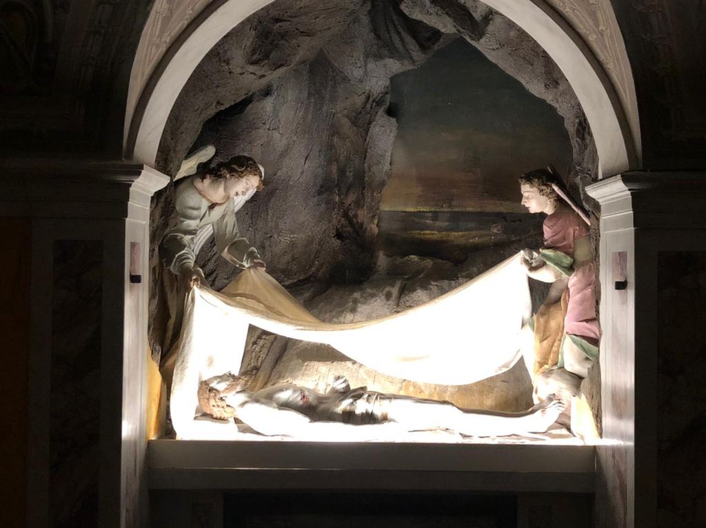 Il fedele viene introdotto in un Sepolcro speciale. La cappella fu realizzata per sostenere la fede nella risurrezione, prima quella di Cristo e poi quella di ogni credente e rappresentare non l'ora conclusiva del Venerdì Santo, ma la prima ora del giorno dopo il sabato. Gesù è raffigurato nei primi attimi del risveglio il corpo di Gesù: la muscolatura del collo, delle braccia, delle gambe è in tensione; gli occhi sono semiaperti, come la bocca, la testa non è reclinata su un lato, ma ben diritta e un po’ sollevata in avanti. Da notare soprattutto la mano sinistra che è in posizione verticale, mai rappresentata così nelle statue del Cristo morto. Sembra di assistere alla fase iniziale del risveglio, quando, riprendendo coscienza, si raccolgono anche le forze e si inizia il movimento del rialzarsi. Gesù sta per risorgere dal sepolcro.