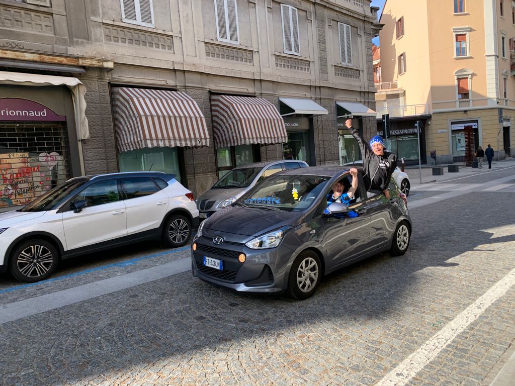 Oggi comunque diverse auto hanno girato per le vie del centro cittadino suonando i clacson e sventolando sciarpe e bandiere per festeggiare lo scudetto conquistato dai nero azzurri di mister Antonio Conte.