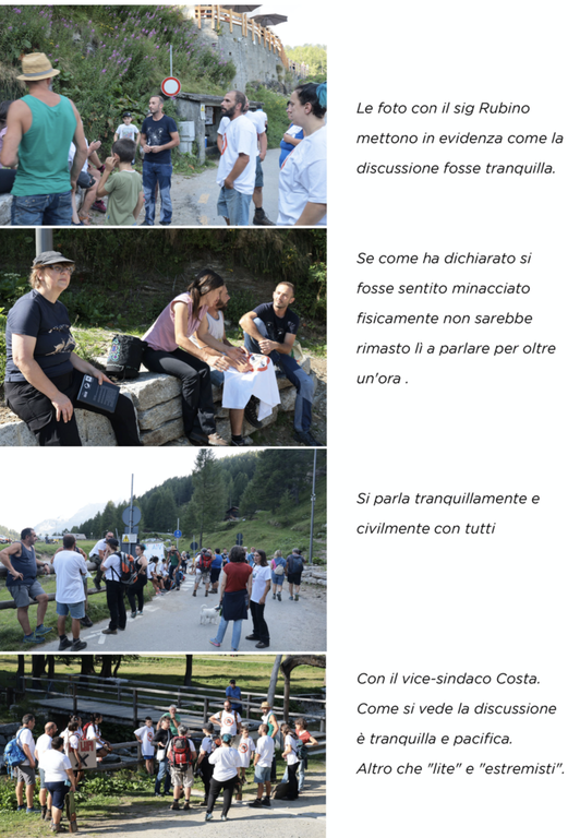 Non siamo andati né all’Alpino né presso altri locali; tantomeno abbiamo fatto “irruzione” da qualsivoglia parte (come infelicemente titolato da un quotidiano). Tutti coloro che erano a Devero hanno potuto constatare come il nostro presidio fosse ben distante dal luogo dell'incontroe come si sia limitato a un pacifico volantinaggio nel quale si parlava con le persone.