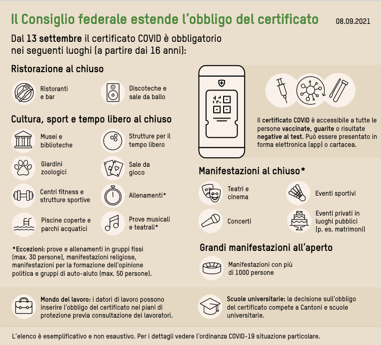Da lunedì 13 settembre, il certificato sarà obbligatorio all’interno di ristoranti e bar. Non è per contro richiesto sulle terrazze, nelle mense per i poveri e nelle strutture della ristorazione nelle aree di transito degli aeroporti. Anche l’accesso alle strutture culturali e per il tempo libero, quali musei, biblioteche, giardini zoologici, centri fitness, palestre di arrampicata, piscine coperte, parchi acquatici, sale da biliardo o da gioco sarà limitato alle persone in possesso di un certificato.