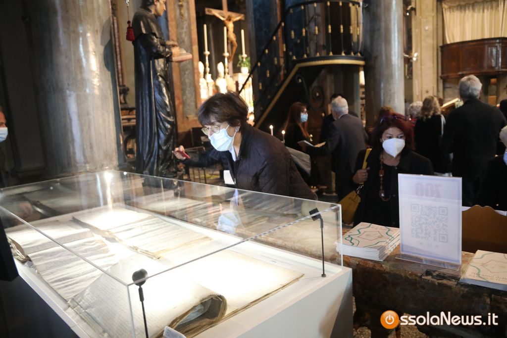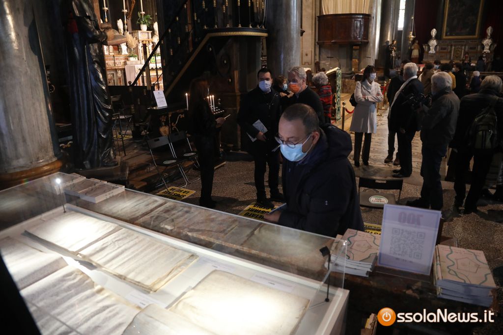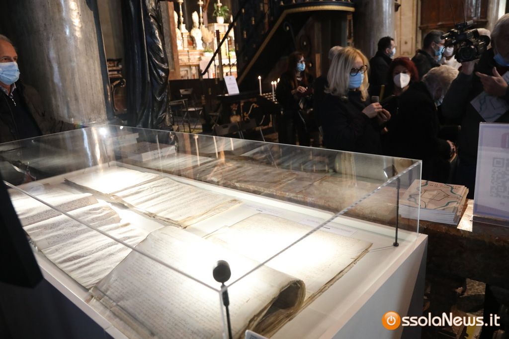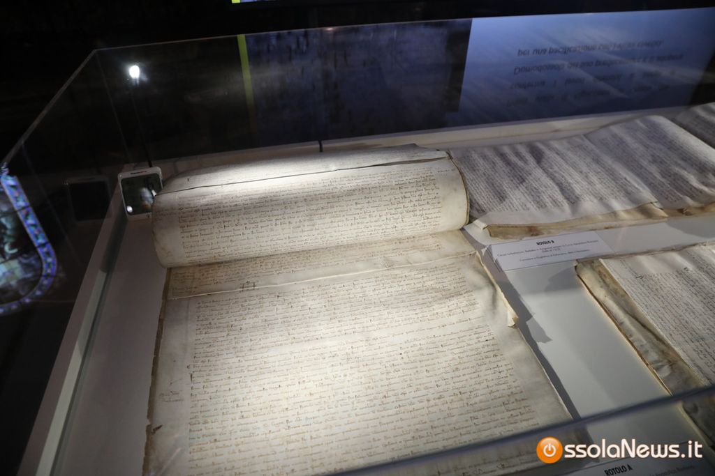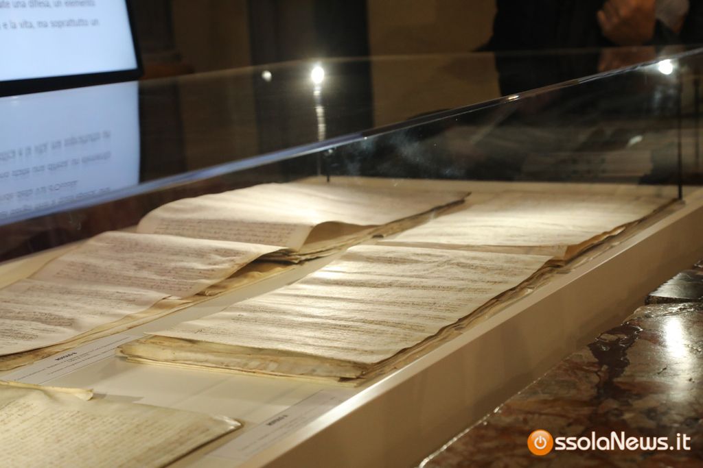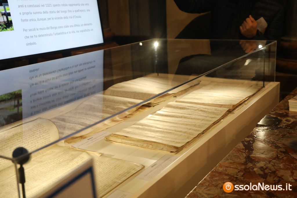 Si tratta di oltre 24 metri di documentazione; i rotoli sono esposti in una teca di vetro le pergamene e furono attentamente studiate anche da don Tullio Bertamini che dedicò alle mura diverse pagine sulla rivista Oscellana. Sull'esposizione è stato girato un video che viene trasmesso negli orari di visita ed stato scritto un volumetto dallo storico Enrico Rizzi ed edito dalla libreria Grossi, in distribuzione gratuitamente. In copertina un disegno acquarellato del '600 che rappresenta le mura di Domo. La mostra resterà aperta fino al 20 novembre. Da lunedì a Venerdì dalle 10 alle 17 , sabato dalle 10 alle 15.30 e domenica dalle 12.30 alle 17.30 . L'esposizione resterà chiusa durante le celebrazioni religiose quali funerali, rosari, battesimi, matrimoni o altre liturgie.