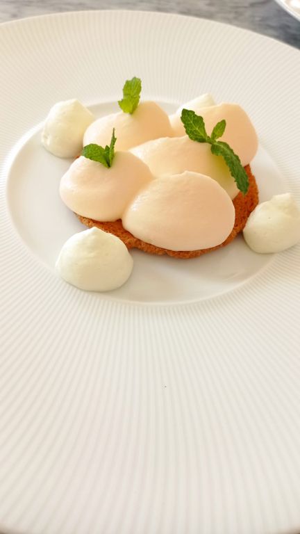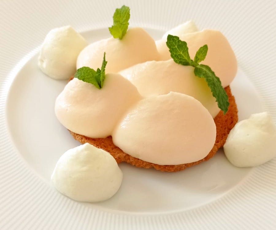 Per 10 porzioni occorrono: 200 g di zucchero, 50 ml di acqua, 100 g di albume, 450 ml di panna, 100 ml di Fil da Fer, 400 ml di panna, sciroppo alla menta q.b., foglie di menta q.b., 200 g di zucchero, 60 g di farina 00, 60 g di burro, 120 g di farina di mandorle, 4 pz di albumi.