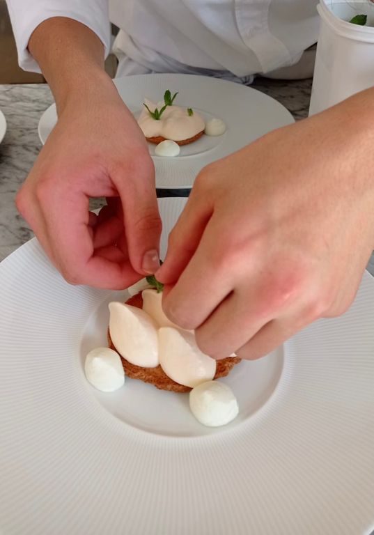 Gli allievi di quinta cucina Paola Giacomotti e Luca Tufano presentano il 'Semifreddo al Fil da Fer con panna montata alla menta e Tegola Valdostana'.