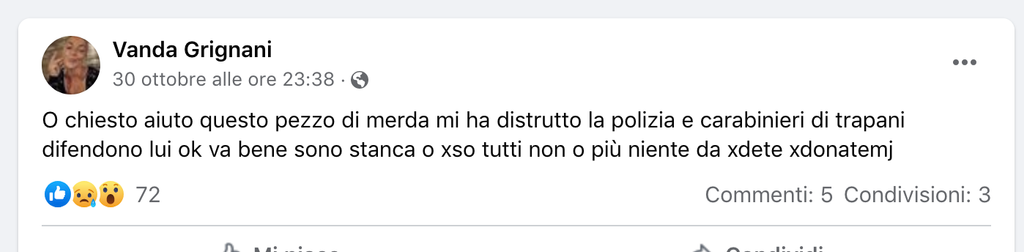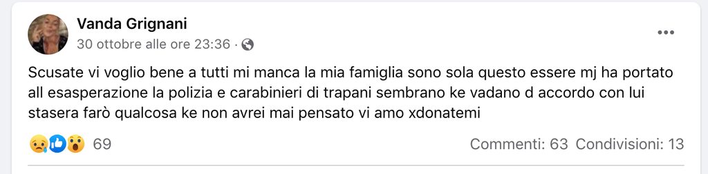 A far propendere gli inquirenti per la premeditazione sono i post di sabato sera della compagna, nella quale sembra annunciare l'intenzione omicida: “Ho chiesto aiuto, mi manca la mia famiglia, sono stanca e non ho più nulla da perdere, perdonatemi”. Parole che lette dopo la tragedia sembrano una vera e propria confessione. La giovane 36enne dopo l'omicidio ha chiamato i Carabinieri e si trova ora rinchiusa nel carcere Pagliarelli di Palermo.