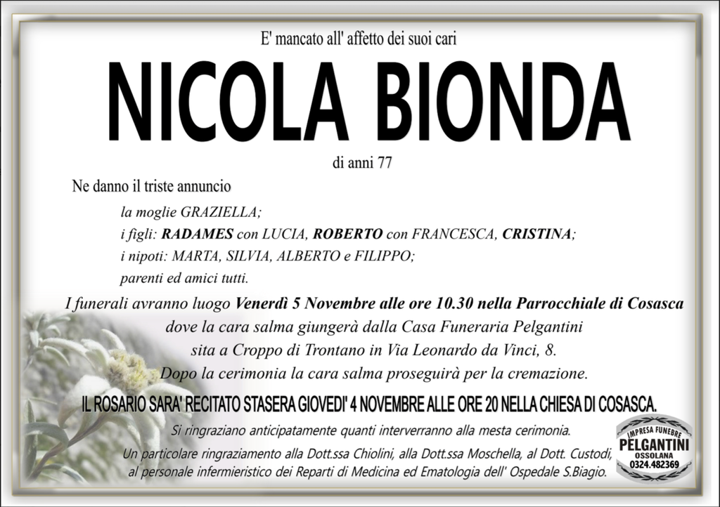 Nicola Bionda di anni 77