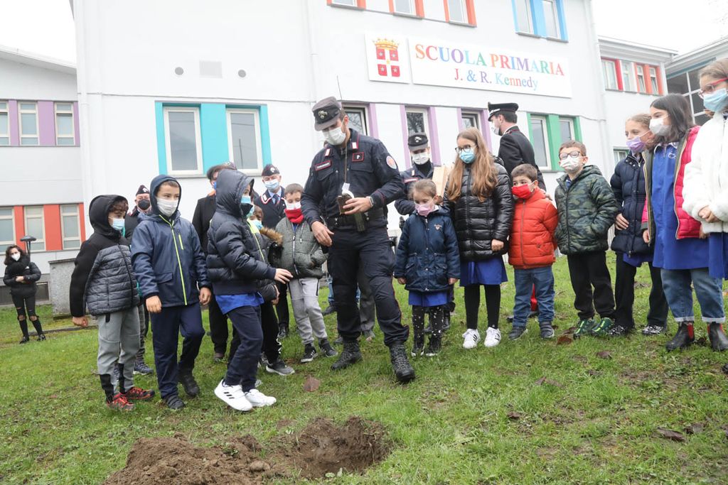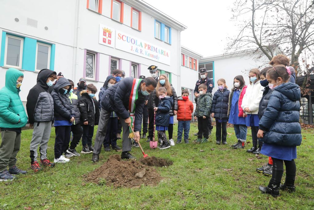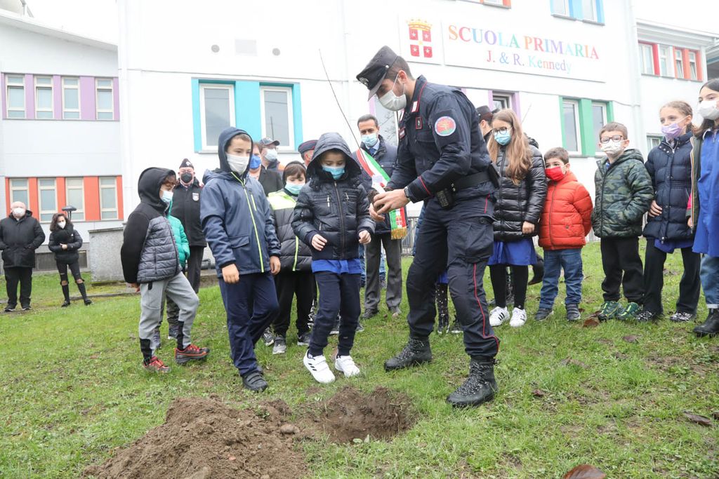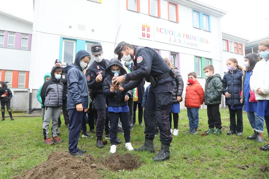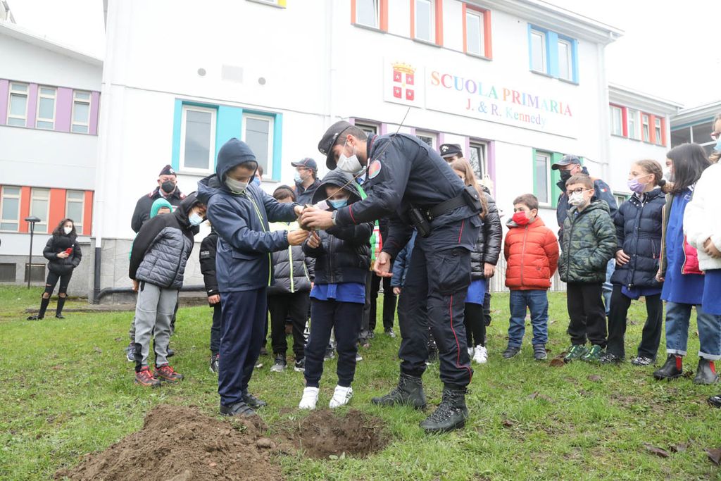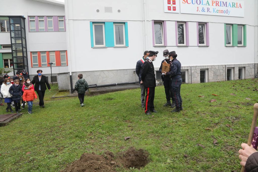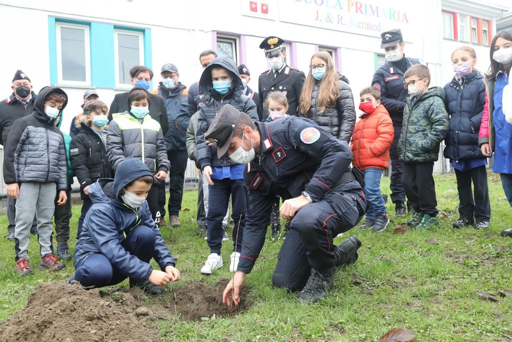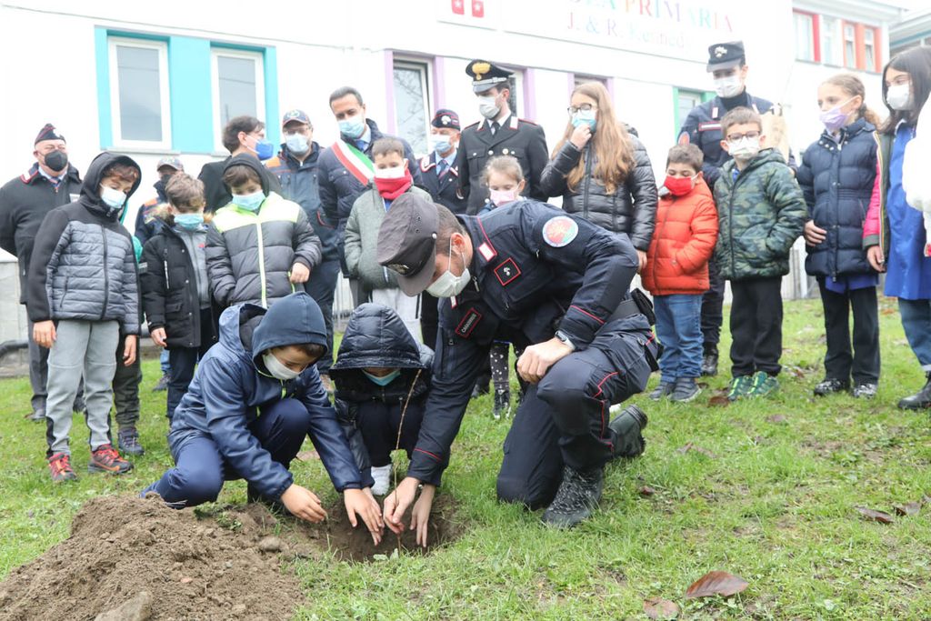 Dopo gli interventi, una rappresentanza di bambini ha piantato con il sindaco e i Carabinieri la talea. La mattinata è proseguita poi con la piantumazione di cinque azalee messe a dimora da tutte le classi delle Kennedy nel giardino della scuola.