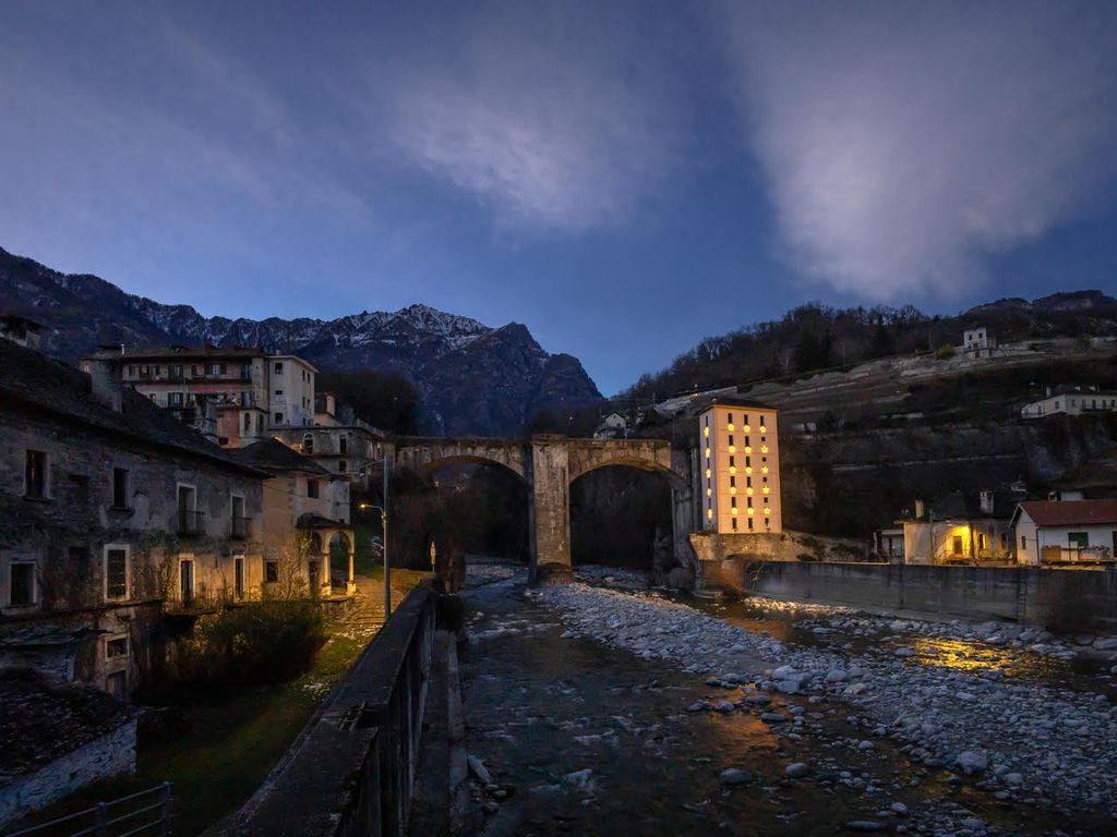 Un’immagine notturna del ponte napoleonico di Crevoladossola. A destra, illuminata con 23 stelle in versione natalizia, l’ex casa del dazio; un scelta che crea un’atmosfera davvero suggestiva.
