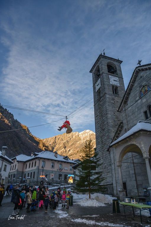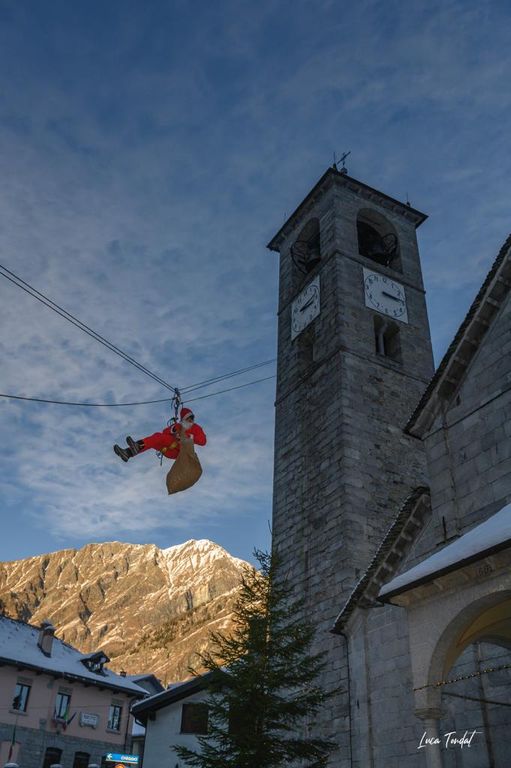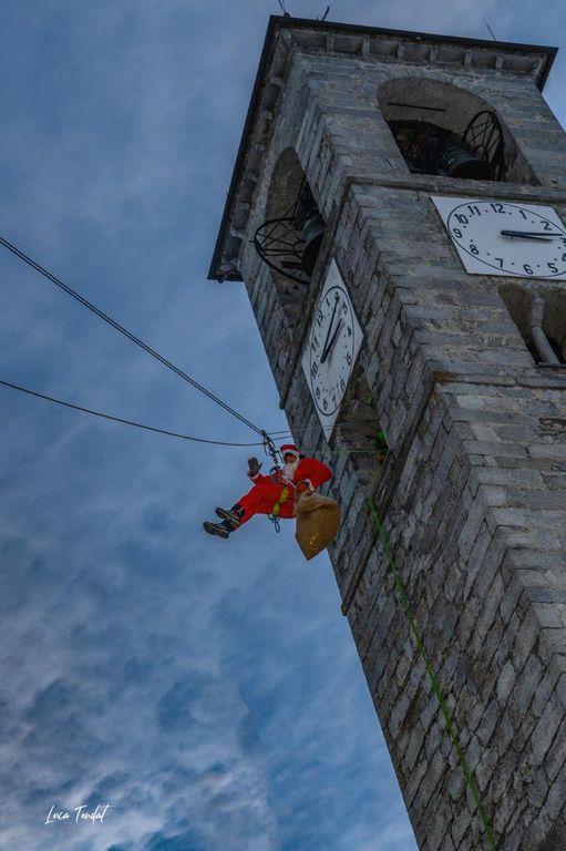 Domenica scorsa, gli uomini del soccorso alpino hanno allestito una teleferica che dalla vetta del campanile scende in piazza. Un Babbo Natale che scende dall’alto portando doni per i bambini del paese. Una bella iniziativa che ha richiamato gente in piazza.