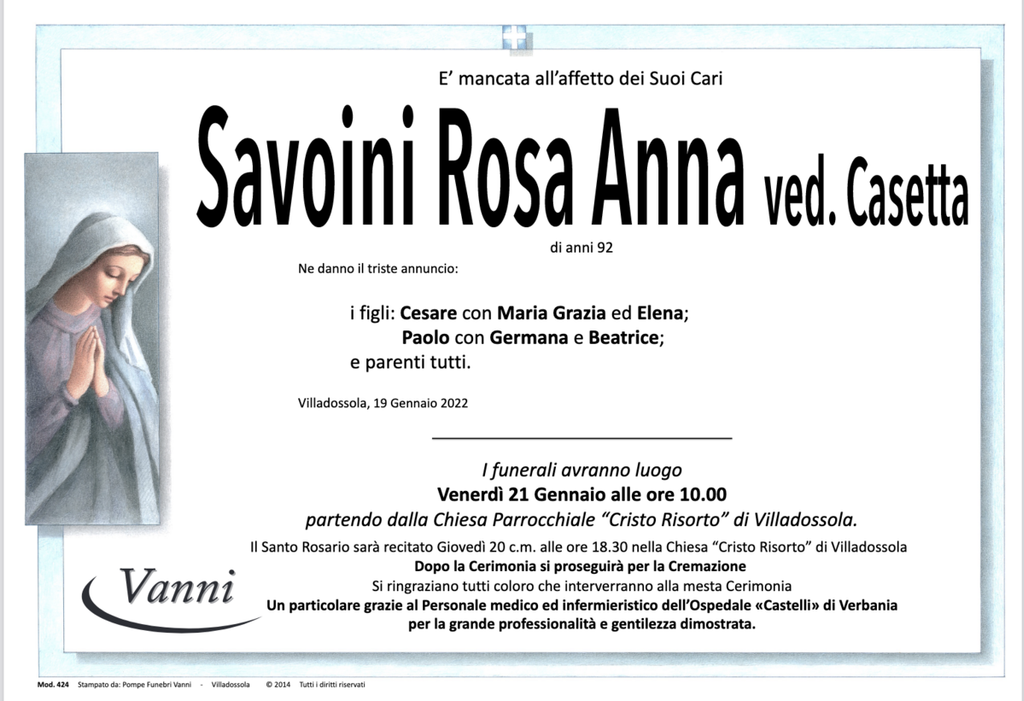 Savoini Rosa Anna ved. Casetta di anni 92