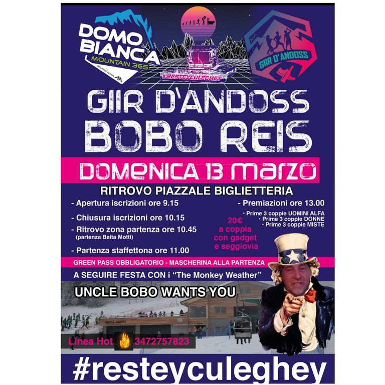 E proprio domenica 13 marzo Domobianca365 sarà palcoscenico della “Bobo Reis” 2022 che torna dopo due anni di assenza forzata causa pandemia. Il ritrovo è alle 9.15 alla Baita Motti da cui scatterà alle ore 11 questa spassosa staffetta a coppie su un percorso totalmente visibile dalla terrazza della Baita Motti. Si parte in salita con il primo frazionista che poi cederà il testimone al compagna o alla compagna di gara per completare i due giro del tracciato sulla neve. Il costo dell’iscrizione è di 20 euro a coppia, comprensivo di risalita con la seggiovia al punto di ritrovo. Dalle 13 premiazioni e festa assicurata per tutti.