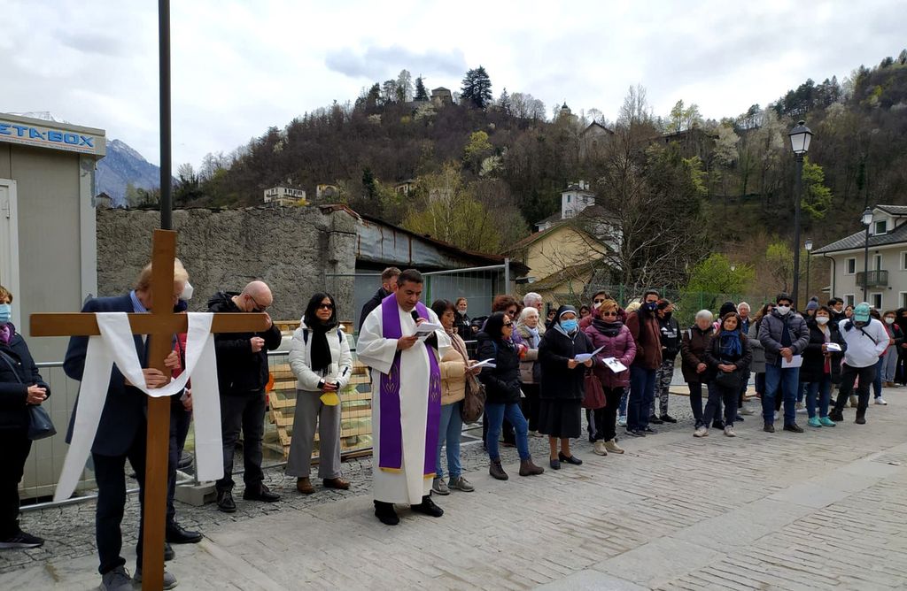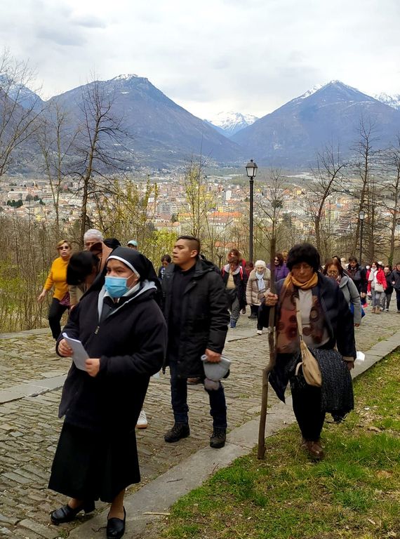 I fedeli prima della via Crucis hanno ricevuto alcune informazioni storiche sulle cappelle da parte della guida Umberto De Petri; sono stati accompagnati lungo il percorso da padre Noè e dai commenti in spagnolo delle stazioni della via Crucis, tratti dalle meditazioni che madre Anna Maria Canopi scrisse per la via Crucis al Colosseo nel 1993. A chiudere il corteo il rettore che si è messo a disposizioni dei fedeli per le confessioni. La via Crucis si è conclusa nel piazzale del Santuario del Santissimo Crocifisso. Prima di fare ritorno a Torino i fedeli hanno visitato la cella del Beato Antonio Rosmini.