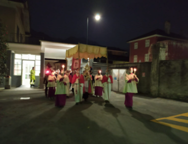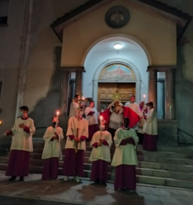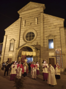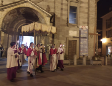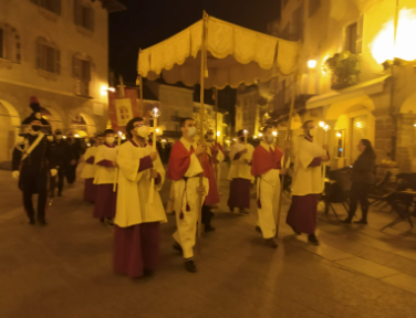 La città si è riappropriata di un rito antico che il Covid da due anni aveva interrotto: la processione del Giovedì Santo con il Santissimo Sacramento. La parrocchia dopo la messa iniziata alle 20.30 ha aperto le porte della chiesa per il corteo con le fiaccole con racchiuso in un ostensorio sottostante un baldacchino un'ostia consacrata ed esposta alla pubblica venerazione della città..