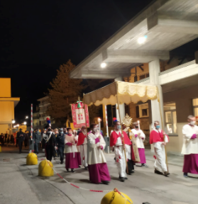 La processione con centinaia di fedeli con la mascherina è sfilata per le vie per giungere nel piazzale della chiesetta dell'ospedale dove i fedeli sono stati invitati a pregare per i malati e per i morti a causa del Covid ed è seguita la benedizione con il Santissimo Sacramento.