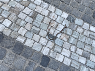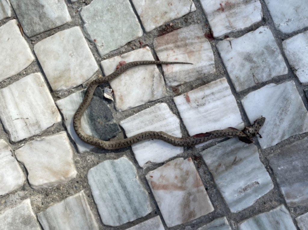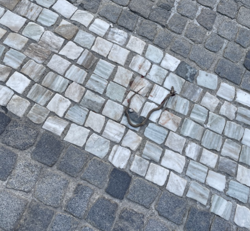 Un serpente in centro a Domo. Il rettile è stato trovato da alcuni passanti sulle strisce pedonali della via. "Lo abbiamo segnalato alla Polizia Municipale ma ci ha risposto che non è compito loro occuparsene" spiega un esercente della zona. "Non è la prima volta che ne vedo uno qui, è già successo in passato anche in via Trieste" spiega ancora. Il rettile morto è ancora sulle strisce pedonali della via.