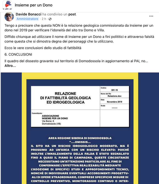 “Tengo a precisare che questa non è la relazione geologica commissionata da Insieme per un dono nel 2019 per verificare l'idoneità del sito tra Domo e Villa” sottolinea il portavoce di Insieme per un Dono Davide Bonacci.