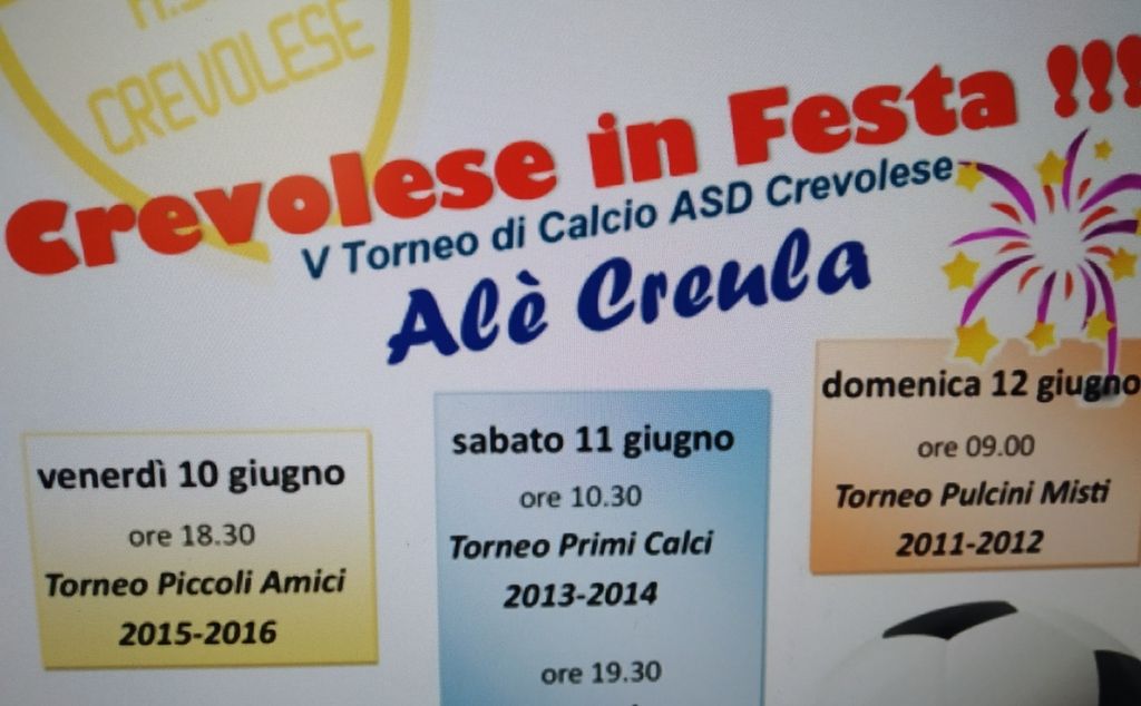 Crevolese in festa a Preglia. La società sportiva, chiuso il campionato e l’annata calcistica, ha programmato tre giorni di festa al campo dell’oratorio di Preglia. In programma un torneo di calcio. S’inizia venerdì 10 giugno alle 18,30 col torneo piccoli amici 2015-2016. Sabato 11, alle 109,30, torneo Primi calci 2013-2014. Domenica 12 alle ore 9 torneo Pulcini misti 2011-2012.