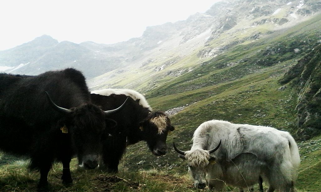 Quest’anno saliremo con una settantina di bovini mentre gli altri popoleranno gli alpeggi della val Tignaga. Una cinquantina di capre ci accompagna, per puro hobby e autoconsumo, avere del latte per la famiglia e le caprette come amiche delle bimbe. Fanno parte della mandria anche degli yak (il bue tibetano). I primi due yak sono arrivati da noi come “capriccio”, animali che ci piaceva avere... Poi abbiamo constatato quanto siano adatti ai terreni impervi e quanto abbiano un temperamento combattivo, utile anche a contrastare l'avvicinarsi del lupo. Per cui abbiamo investito in tal senso, acquistandone altri, si sono poi riprodotti e ora ne abbiamo un discreto numero, oltre agli incroci fra mucche e yak.