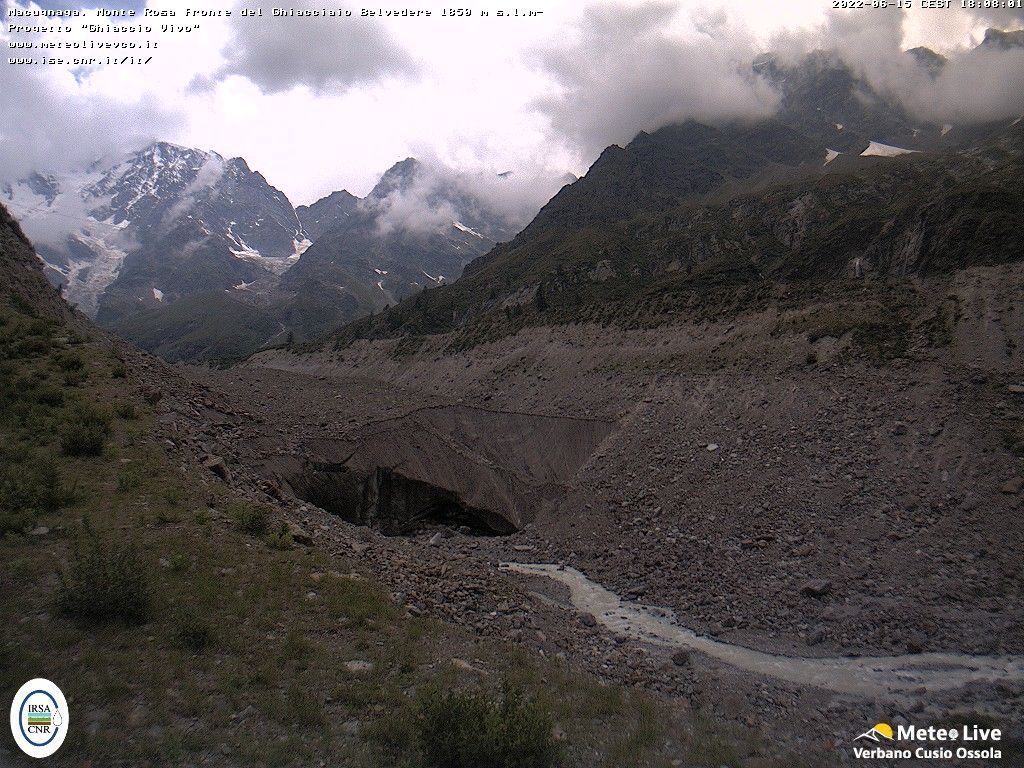 Dalla fronte del ghiacciaio Belvedere, uno dei più importanti in Ossola, una nuova webcam in diretta monitora lo stato del ghiacciaio.