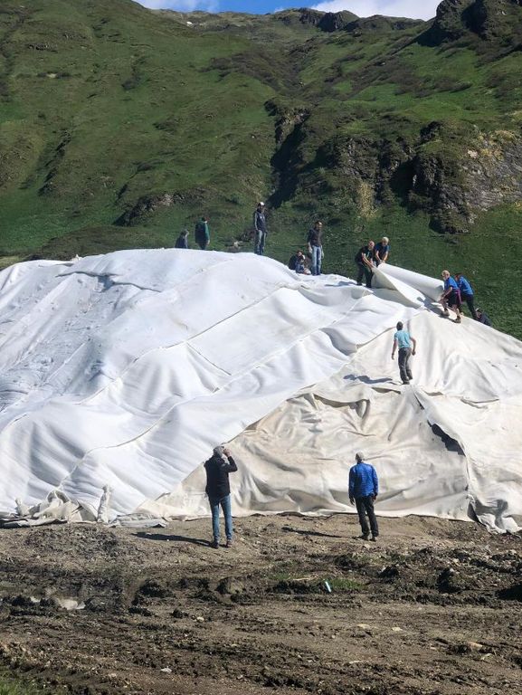 Gli 8000 metri cubi di neve sono stati coperti da tecnologici teli geotermici con fibre di alluminio, intervallati da strati isolanti di ovatta grazie al supporto tecnico di Snow Makers, un’azienda specializzata svizzera. I teli sono poi stati legati uno all’altro con un sistema di velcri e cuciture a filo. Questi speciali materiali di copertura garantiscono il doppio beneficio di proteggere termicamente la massa sottostante e, grazie all’azione riflettente, di non far penetrare i raggi UVA. La neve resterà impacchettata sotto i teli per tutta la stagione estiva e sarà posata in autunno. Secondo le stime gran parte della neve stoccata servirà a coprire circa 3 km dell’anello della pista di fondo di Riale (complessivamente lunga oltre 12 km), permettendo una prima attività sportiva anche in assenza di nevicate e senza ricorrere a cannoni sparaneve e quindi all’utilizzo eccessivo di energia elettrica e acqua.