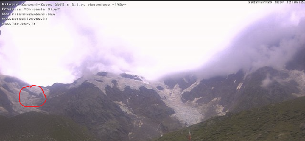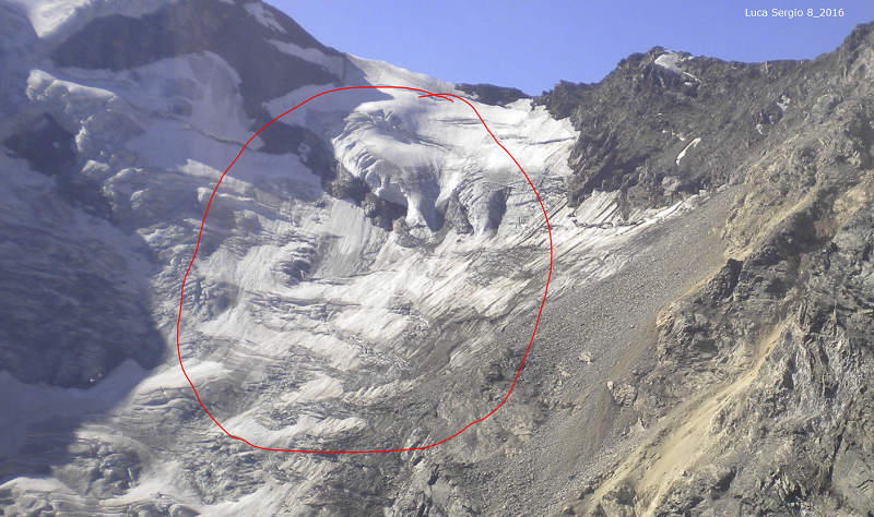 Scrive a proposito: “Ecco cosa ho scoperto da osservatore analizzando attentamente le immagini, nei bacini di carico del Ghiacciaio delle Locce un blocco di ghiaccio quasi triangolare si è distaccato dal corpo principale, con ben visibile la roccia sopra e ai lati, sotto sembrerebbe appoggiato al proseguimento del corpo principale. Analizzando immagini dei sorvoli aerei effettuati nel 2016 si nota che in quella zona il ghiacciaio era un blocco unico. Dal 2016 sono passati 7 anni e il Ghiacciaio è cambiato molto ma questo cambiamento, che a prima vista sembrerebbe il cedimento di una porzione di ghiaccio, è avvenuto solamente nell’ultimo mese, per l’esattezza in 5/6 giorni dal 9 al 15 di luglio 2022. Dire con esattezza cosa stia avvenendo è difficile senza indagini più approfondite magari da enti specializzati. Potrebbe anche essere che la forte fusione abbia messo in evidenza il substrato roccioso e non sia una spaccatura. Quello che è certo è che così il ghiacciaio non lo abbiamo mai visto. Gli ultimi aggiornamenti mostrano che nella foto del giorno 30 a confronto con il giorno 29 luglio alle ore 21:30, si nota come quel blocco di ghiaccio quasi triangolare che sembrerebbe essersi distaccato si stia frantumando”.
