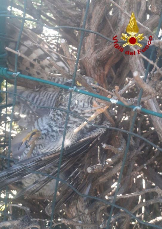 L'animale, un esemplare di sparviero adulto, si era incastrato in una siepe di rosmarino senza essere più in grado di prendere il volo. Sul posto la squadra di vigili del fuoco ha praticato un ritaglio nella recinzione e reciso i rami della pianta che avvolgevano il rapace. Con cura è stato trasportato in una zona priva di ostacoli dove è stato liberato.