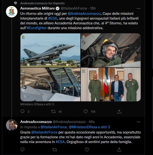 "Grazie @ItalianAirForce per questa eccezionale opportunità, ma soprattutto grazie per la formazione che mi hai dato negli anni in Accademia, essenziale nella mia avventura in #ESA. Orgoglioso di sentimi parte della famiglia" ha risposto l'ingegnere.
