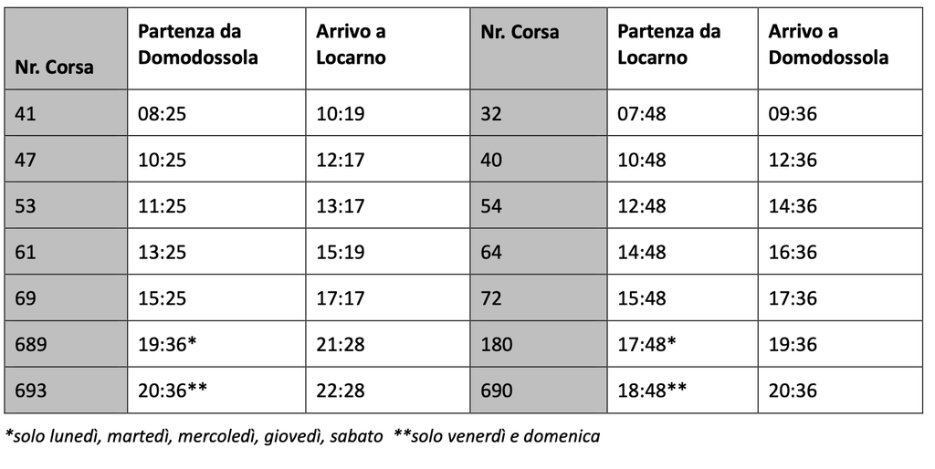- Corsa 181: con partenza da Camedo alle ore 18:39 in direzione di Locarno