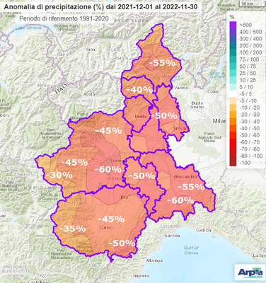 Lo dice Arpa Piemonte che pubblica i dati e la cartina delle province piemontesi e analizza il problema siccità che ha caratterizzato gli ultimi 12 mesi.