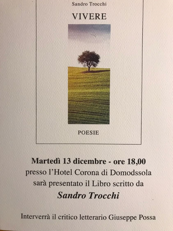 Martedì 13 dicembre, ore 18, all’Hotel Corona di Domodossola presentazione del libro di poesie di Sandro Trocchi 'Vivere'. L'incontro vedrà l'intervento del critico Giuseppe Possa.