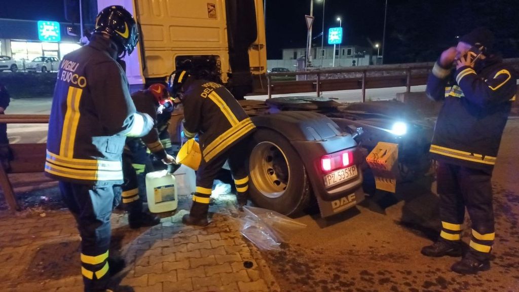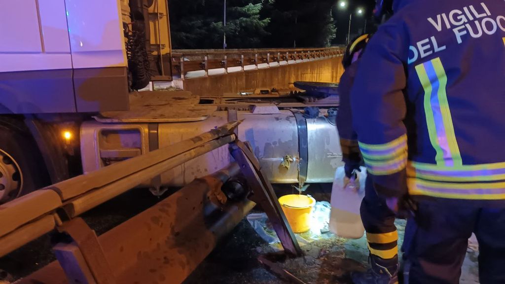 Sul posto i Vigili del fuoco per cercare di contenere la fuoriuscita di carburante dal serbatoio danneggiato della motrice del tir.