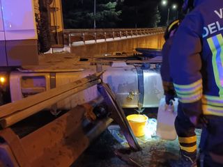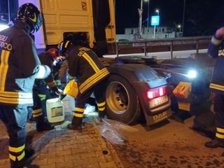 Sul posto i Vigili del fuoco per cercare di contenere la fuoriuscita di carburante dal serbatoio danneggiato della motrice del tir.