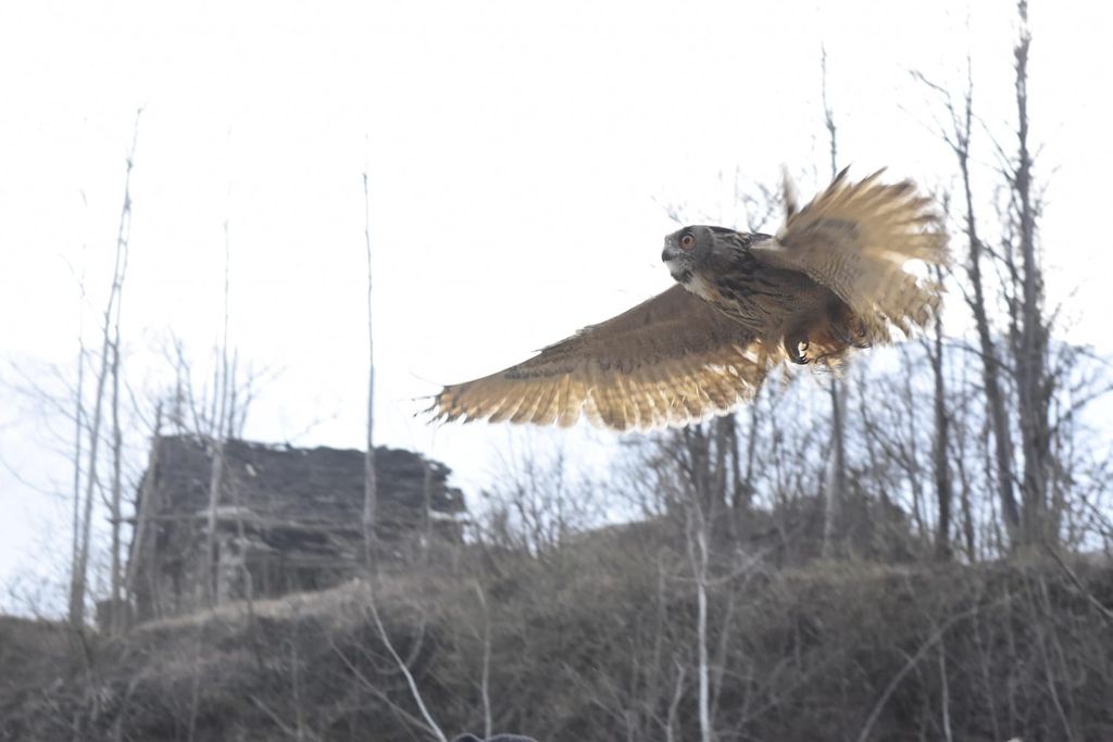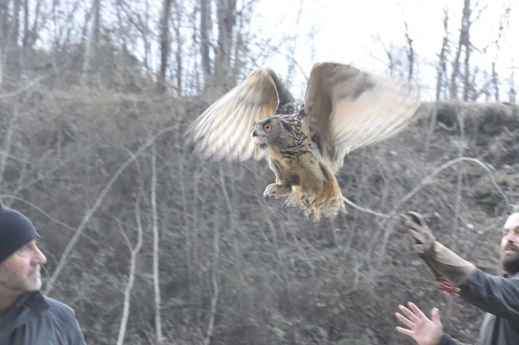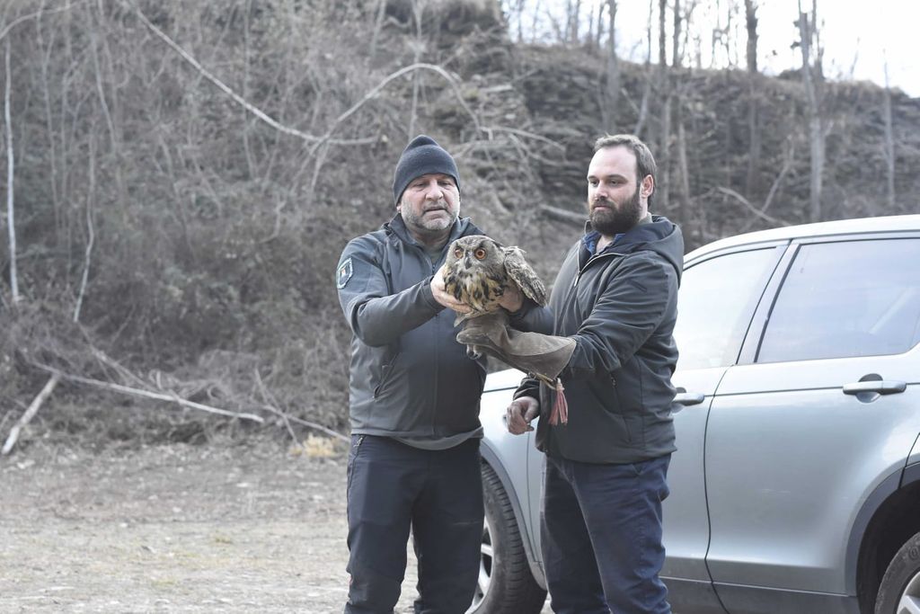 Liberato nei boschi di Genestredo a Vogogna un gufo reale. Il bellissimo rapace era stato soccorso dagli agenti della polizia provinciale e curato dal veterinario Uberto Calligarich, responsabile del Centro di recupero per animali selvatici del Vco.