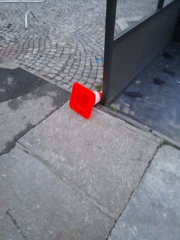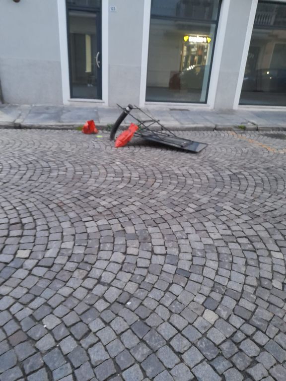 Le reti sono state rimesse a posto, mentre il carrello con le sedie è ancora abbandonato sul marciapiedi di via Binda.
