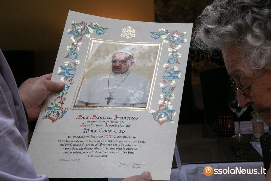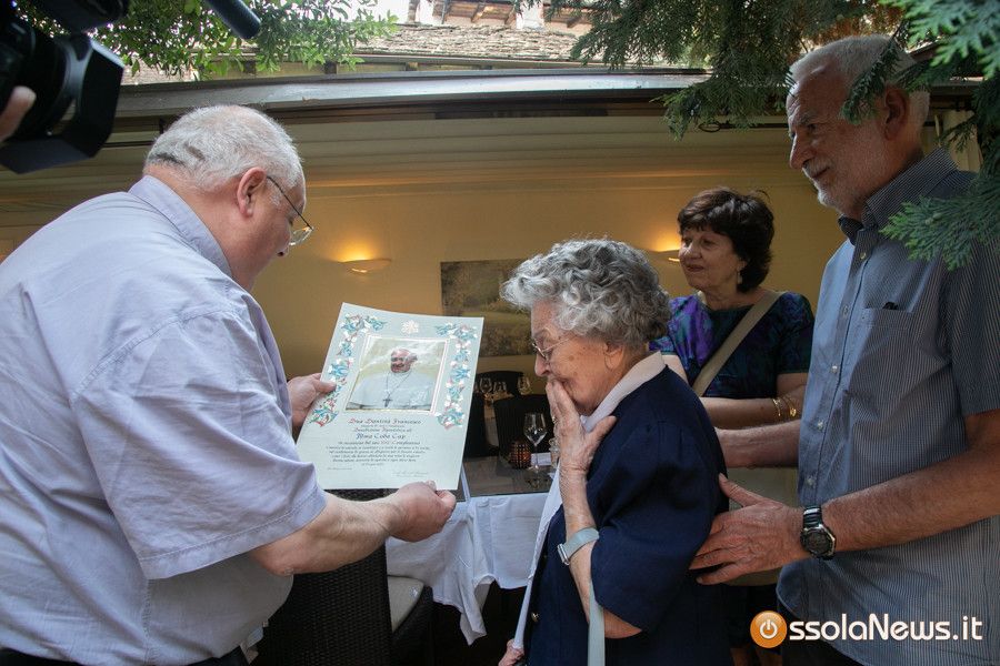 Ai festeggiamenti anche il parroco domese don Vincenzo Barone, che ha consegnata ad Ala un regalo molto, una pergamena con la benedizione papale. Don Vincenzo ha letto la pergamena, commuovendo la maestra Ala, la quale non ha potuto nascondere la sua gratitudine. Accanto a lei, la sua famiglia. E chi ha partecipato alla festa domenica è stato invitato a non portare doni, ma a devolvere fondi ad un progetto solidale in Etiopia, al arealizzazione di pozzi per l'acqua. Una scelta legata alla famiglia della maestra, visto che il nipote è un ingegnere idraulico che sta attualmente lavorando in quel paese africano.