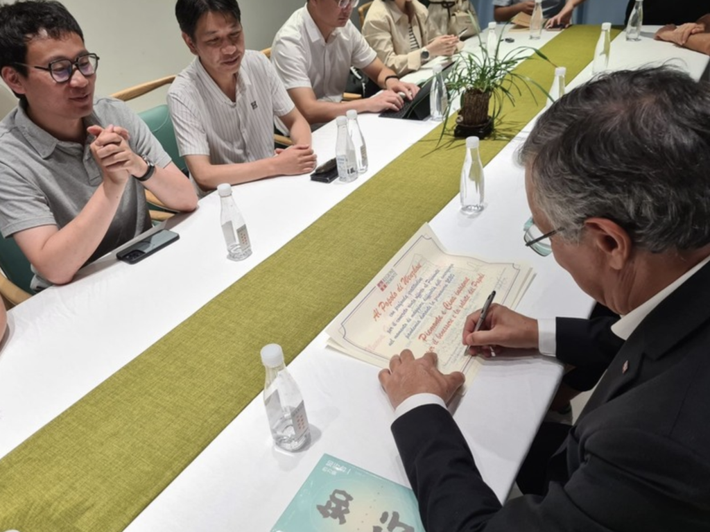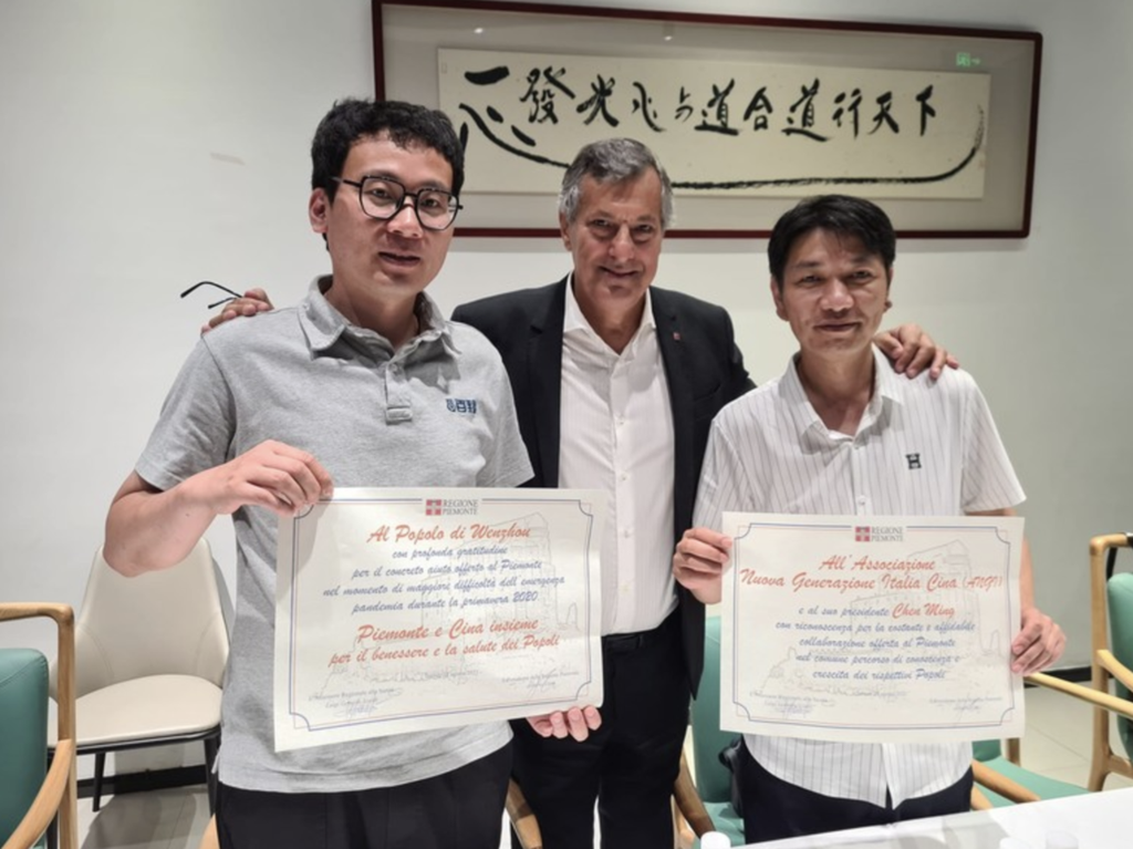E’ il testo della pergamena che ieri sera l’assessore regionale della Sanità del Piemonte, Luigi Genesio Icardi, ha consegnato direttamente nelle mani del direttore dell’Ufficio Affari esteri di Wenzhou, Chen Jin, nella sede della Regione di Wenzhou, in Cina, esprimendo il ringraziamento ufficiale della Regione Piemonte alla comunità cinese per l’aiuto ricevuto durante la pandemia.