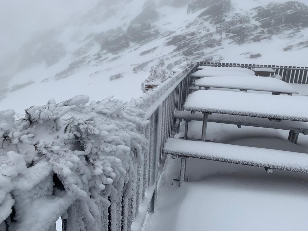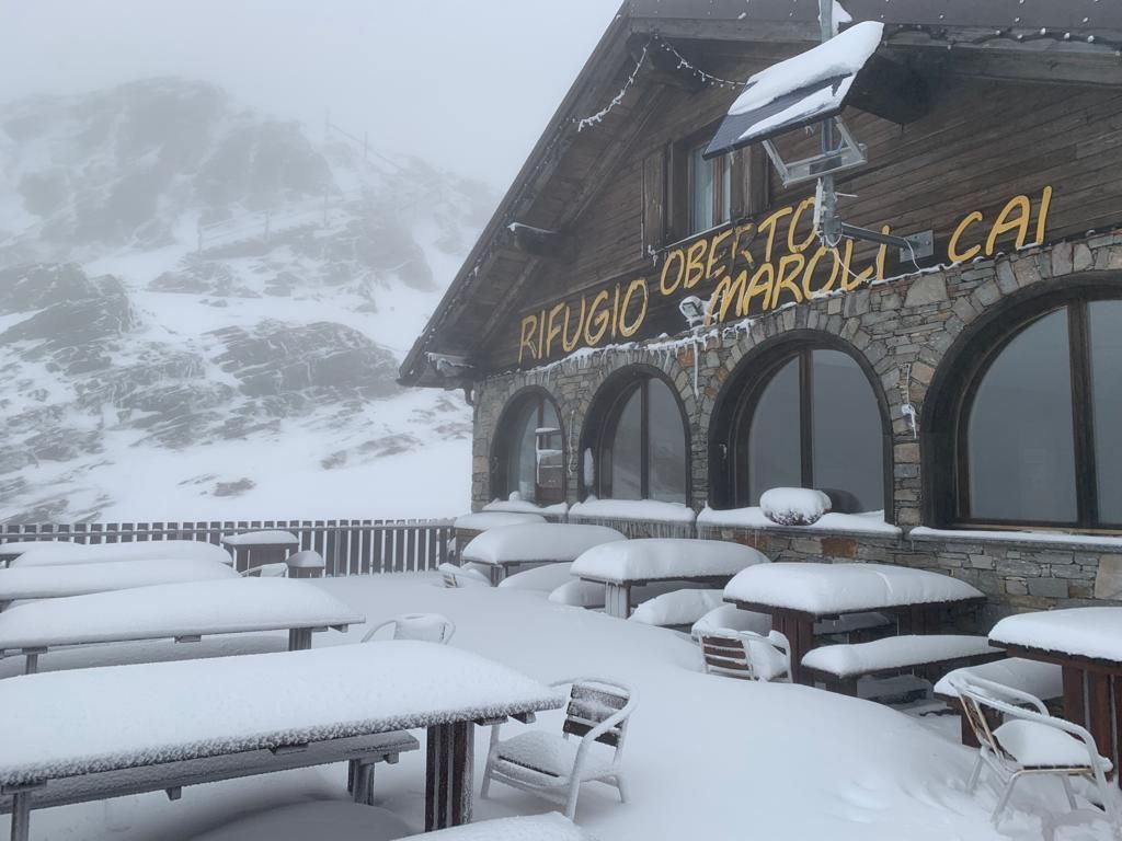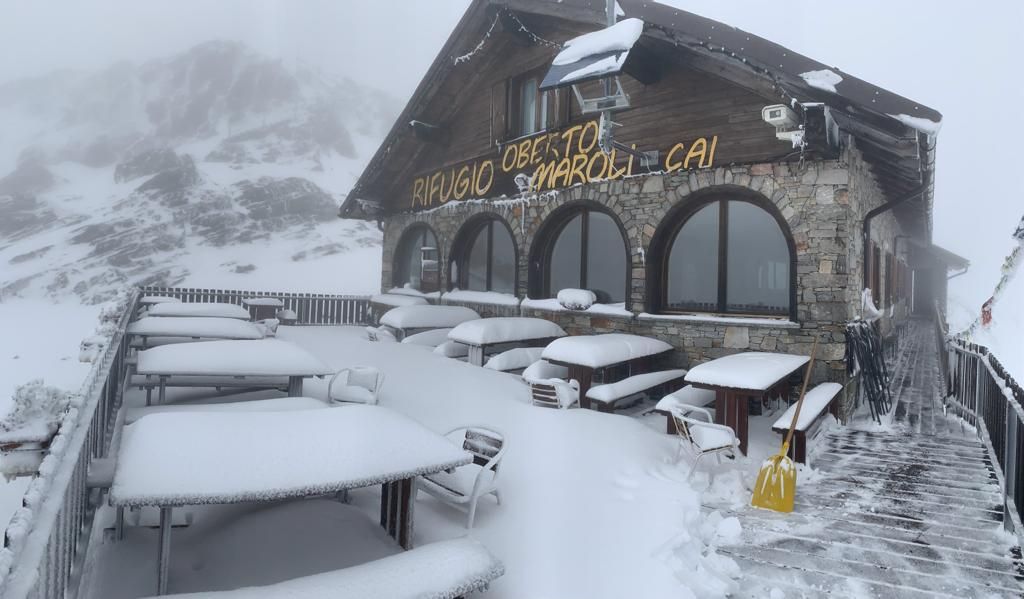 Neve estiva al Monte Moro. I titolari del rifugio Oberto Maroli, Alberto Cottini e Francesco Valente, questa mattina hanno avuto un fresco risveglio. Sulla terrazza del rifugio a 2796 metri di altitudine la coltre nevosa ha raggiunto i 40 centimetri.