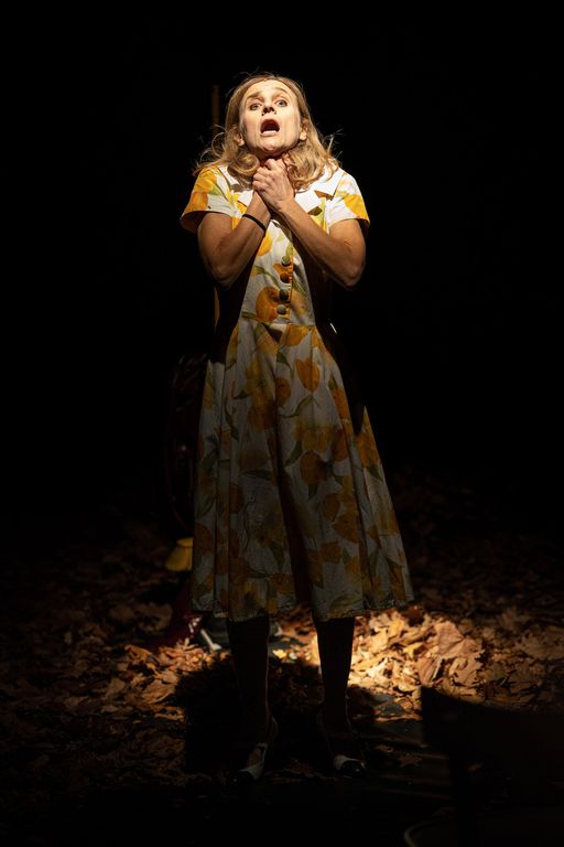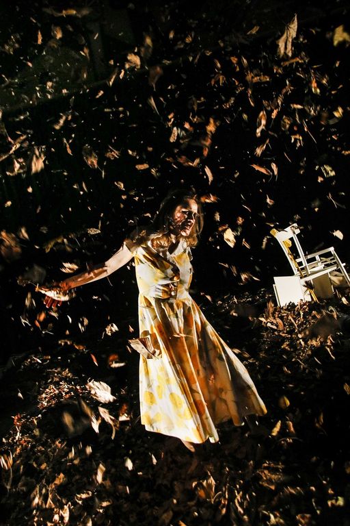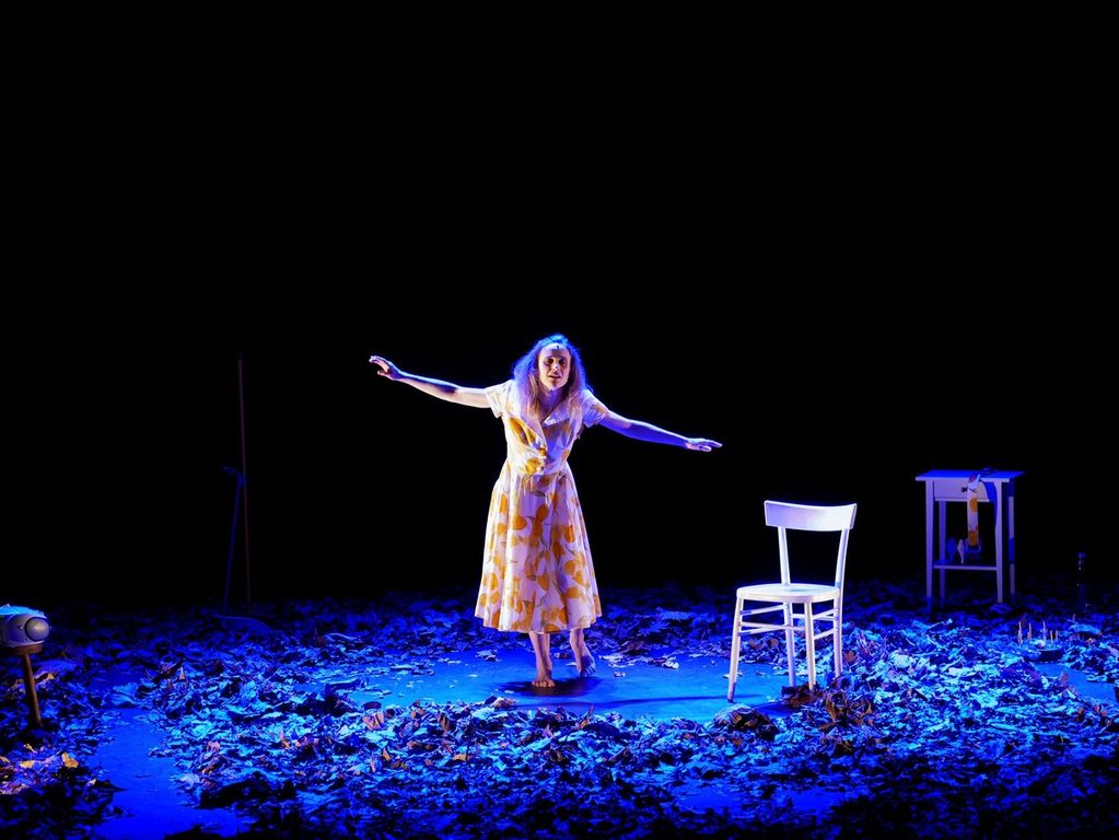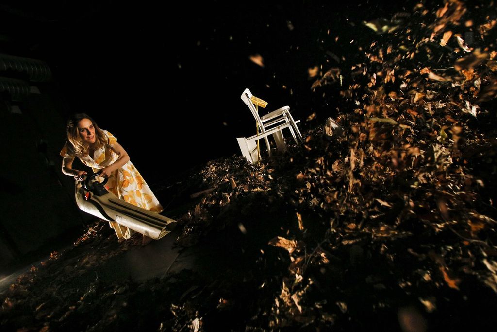 Il linguaggio scelto unisce più discipline: il teatro di parola, la danza, la musica e il teatro d’object. Molto forte è l’elemento figurativo, caratterizzato dalla presenza di un pavimento ricoperto di foglie secche che accompagnano fisicamente ogni azione e diventano metafora del rinnovamento: la donna si disegna gli spazi del proprio labirinto, in una sorta di Dogville d’appartamento che muta con il racconto di sé, capace di segnare conquiste e perdite.