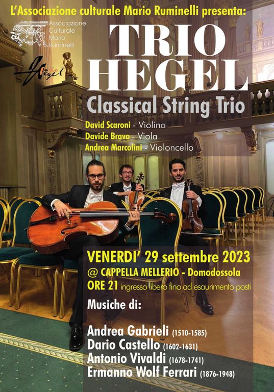 Un nuovo interessante concerto per trio d'archi è offerto da Associazione Culturale Mario Ruminelli e Fondazione Paola Angela Ruminelli. In programma venerdì 29 settembre alle ore 21 alla Cappella Mellerio di Domodossola, l'incontro musicale di inizio autunno è un concerto “veneziano”: quattro compositori vissuti a Venezia, molto legati alla città lagunare – Andrea Gabrieli, Dario Castello, Antonio Vivaldi ed Ermanno Wolf Ferrari. Protagonista il Trio Hegel – formato da David Scaroni al violino, Davide Bravo alla viola e Andrea Marcolini al violoncello – che tornerà dalla tournée in Finlandia per esibirsi in Ossola.