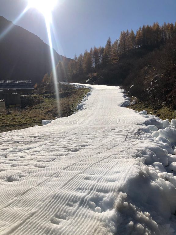 La risposta si chiama snowfarming, una tecnica di conservazione della neve che Gianluca Barp, imprenditore turistico locale e responsabile del Centro Fondo Riale, ha iniziato a sperimentare 5 anni fa e che lo ha portato lo scorso maggio a immagazzinare sotto tecnici teli geotermici circa 8.000 metri cubi di neve. Un quantitativo che, nonostante l’estate torrida prolungatasi anche a settembre, è riuscito preservare in misura sufficiente (si registra una “perdita” di neve di circa il 40%) a garantire l’apertura della pista.