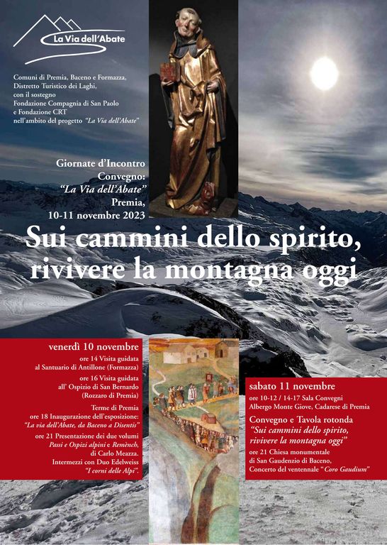 Sei mesi di appuntamenti voluti dai Comuni di Baceno, Premia e Formazza per valorizzare la Via dell'Abate, da Baceno a Disentis, dalla Val d'Ossola al Canton Grigioni, uno dei percorsi escursionistici più affascinanti dell'arco alpino, che il Cai di Formazza ha "battezzato" lo scorso mese di settembre con un trekking impegnativo e di grande valore anche simbolico. Il ciclo di manifestazioni volge dunque al termine: venerdì 10 e sabato 11 novembre una serie di incontri,