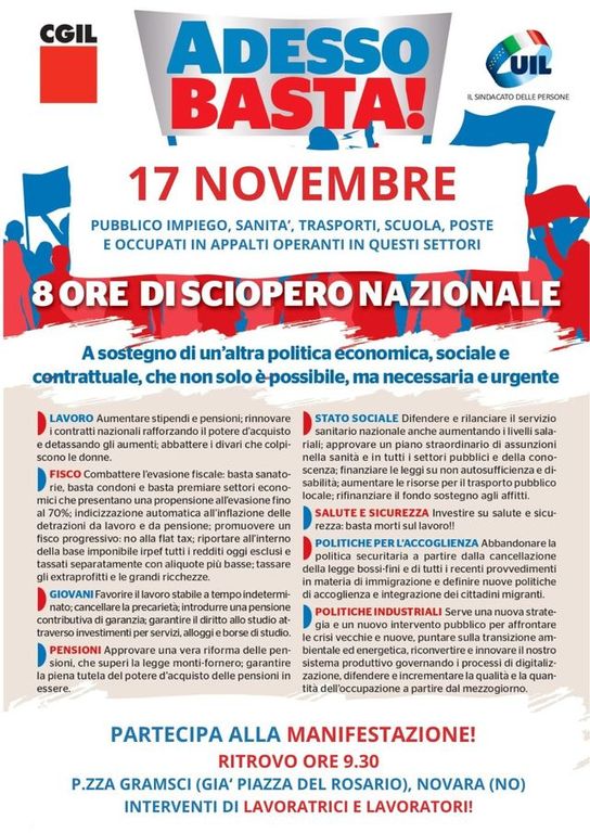 Per venerdì 17 novembre lo sciopero riguarderà il pubblico impiego, la sanità, i trasporti, la scuola, le poste e gli occupati in appalti operanti in questi settori. Il ritrovo è in programma per le ore 9.30 in Piazza Gramsci, a Novara.
