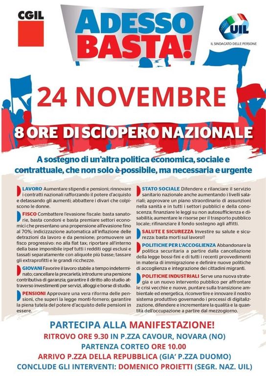 Per quanto riguarda, invece, venerdì 24 novembre, lo sciopero coinvolge tutti gli altri settori. Il trovo è alle ore 9.30 in Piazza Cavour a Novara; alle 10.00, invece, la partenza del corteo con arivo in Piazza della Repubblica.