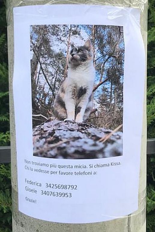 “Cerchiamo disperatamente la nostra gatta Kissa, pelo corto bianco, grigio e rosso chiaro, razza europea. È sterilizzata, ha 4 anni, diffidente con gli estranei. Non rientra a casa da sabato 4 novembre 2023. Abitiamo a Santa Maria Maggiore, in Val Vigezzo, in zona Asl - via Marconi. Siamo disponibili a dare una ricompensa a chi la troverà. Potrebbe essersi intrufolata in qualche motore, essere rimasta chiusa da qualche parte, oppure potrebbe essere successo qualcosa di grave. Qualcuno, magari, ha delle informazioni utili. Se la vedete, potete inviarci una foto o chiamarci e arriveremo al più presto per prenderla. Per favore, controllate le vostre cantine, box, soffitte, locali chiusi. Chiunque abbia notizie può contattare, pertanto, i seguenti numeri: 3407639953 oppure 3425698792”.