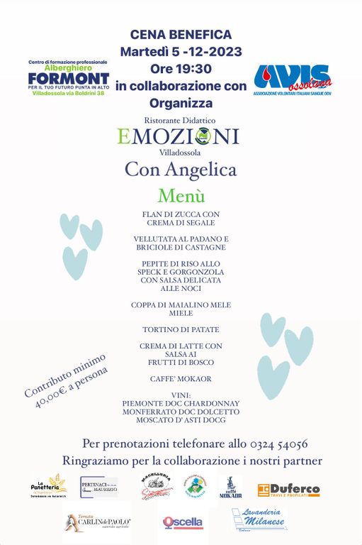 L’istituto alberghiero Formont di Villadossola organizza una cena speciale presso il proprio ristorante didattico, Emozioni. La serata, in programma martedì 5 dicembre dalle 19.30, ha scopo benefico: l’intero ricavato della cena verrà infatti donato alla famiglia di Angelica, un’allieva del Formont che si trova attualmente ricoverata all’ospedale Regina Margherita di Torino, a causa di un tumore alla spina dorsale.