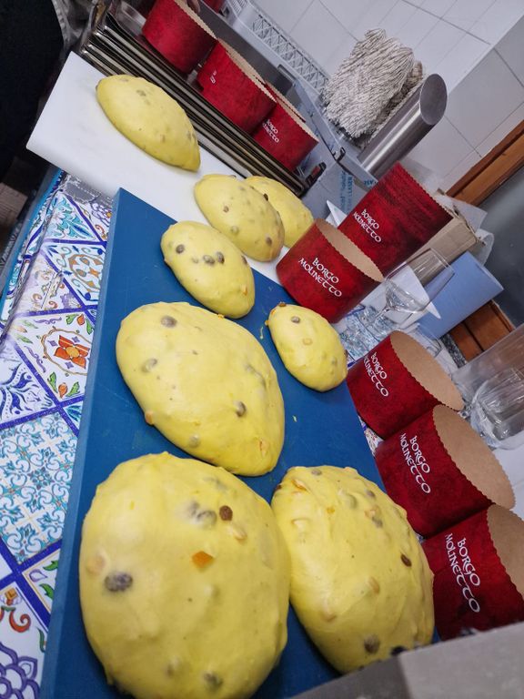 I panettoni del "Borgo Molinetto" vengono prodotti in tre varianti: classico, al pistacchio, e alle pere e cioccolato. Il panettone classico è arricchito con canditi realizzati artigianalmente con arance e limoni provenienti dal Sud d'Italia e di eccezionale qualità, mentre le uvette sono selezionate con cura. Il panettone liscio viene invece arricchito con una profumatissima crema al pistacchio e glassato con una copertura sempre al pistacchio. Infine è disponibile la versione del panettone con pere caramellate e cioccolato fondente.