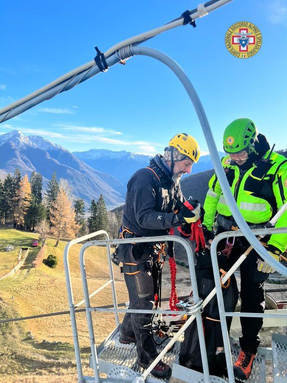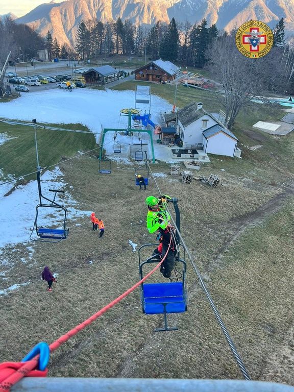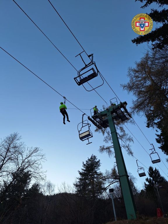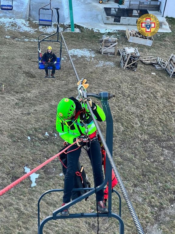 Il simulato è stato preparato nel modo più simile alla realtà, caricando la linea di ipotetici sciatori bloccati sulla seggiovia.