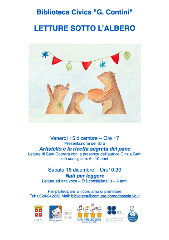 Per questioni organizzative, per partecipare a tutti gli eventi è richiesta la prenotazione telefonando al numero 0324/242232 oppure scrivendo una mail a: biblioteca@comune.domodossola.vb.it.