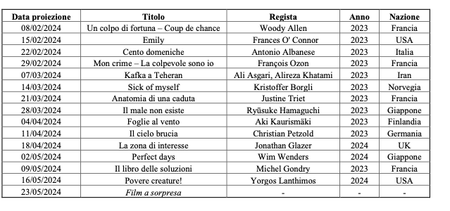 La stagione sarà composta da 15 serate, tutti i giovedì dall’8 febbraio al 23 maggio, con un’unica sosta per la festività del 25 aprile. La selezione non è stata semplice, vista la quantità di pellicole di valore che sono uscite nell’ultimo anno. Come detto, la selezione è di recentissima uscita (tutti, tranne due, sono stati distribuiti in Italia da ottobre 2023 in avanti; quattro sono addirittura del 2024). Per l’ultimo titolo della stagione ci siamo riservati una casella vuota, in modo da poter scegliere a tempo debito una pellicola in uscita in primavera.