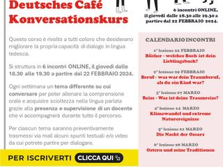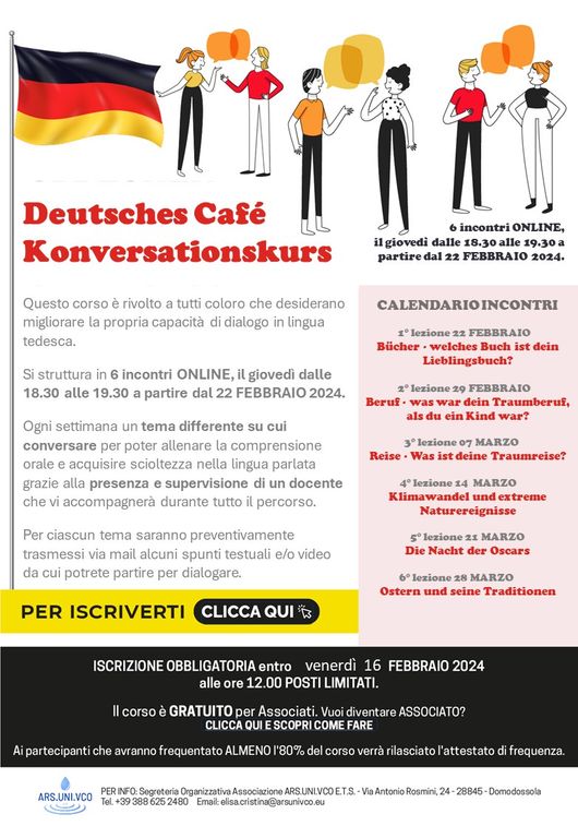 A partire da giovedì 22 febbraio, Ars.Uni.Vco propone un corso di lingua tedesca, aperto a tutti coloro che desiderano migliorare le proprie capacità di conversazione e dialogo.